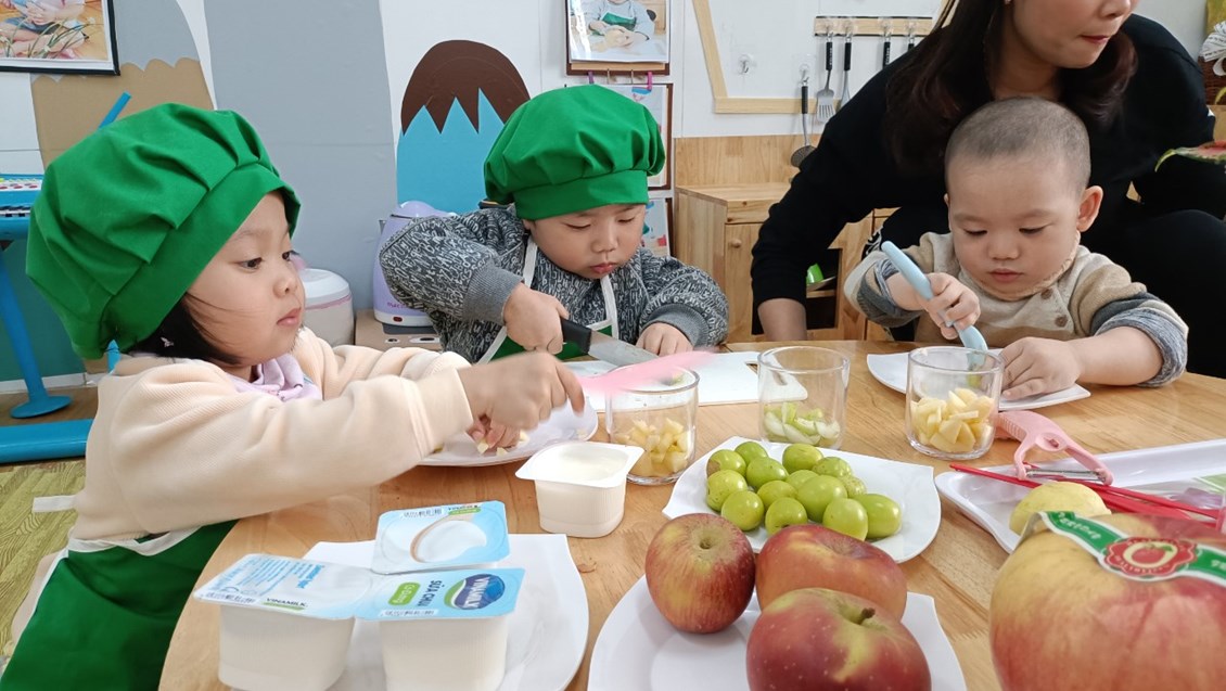 Các bạn say sưa gọt, cắt quả táo để làm món Táo dầm sữa chua