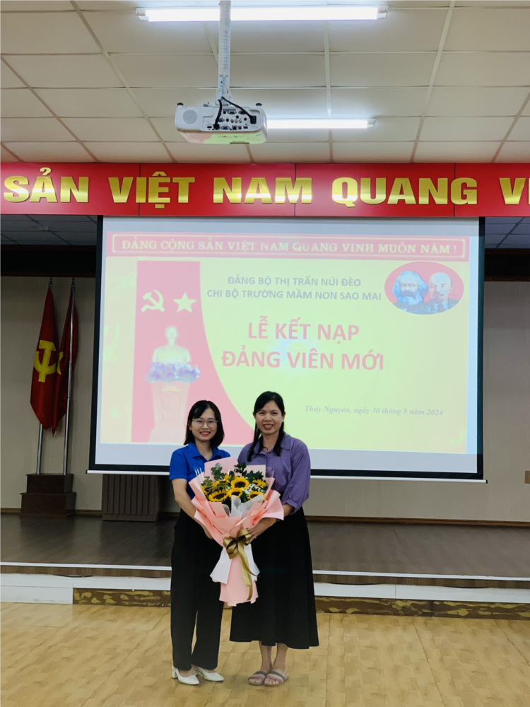 Công tác phát triển Đảng viên mới luôn được Chi bộ mầm non Sao Mai và nhà trường quan tâm chú trọng. Nâng cao số lượng và chất lượng Đảng viên trong năm học 2024-2025 được thúc đẩy mạnh mẽ. Ngày hôm nay, thứ 6 ngày 30 tháng 8 năm 2024. Chi bộ MN Sao Mai long trọng tổ chức lễ kết nạp Đảng viên cho Đ/c Nguyễn Thị Hà.