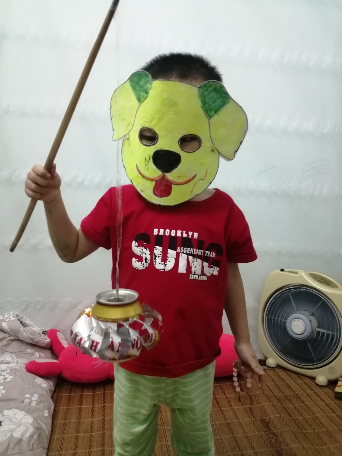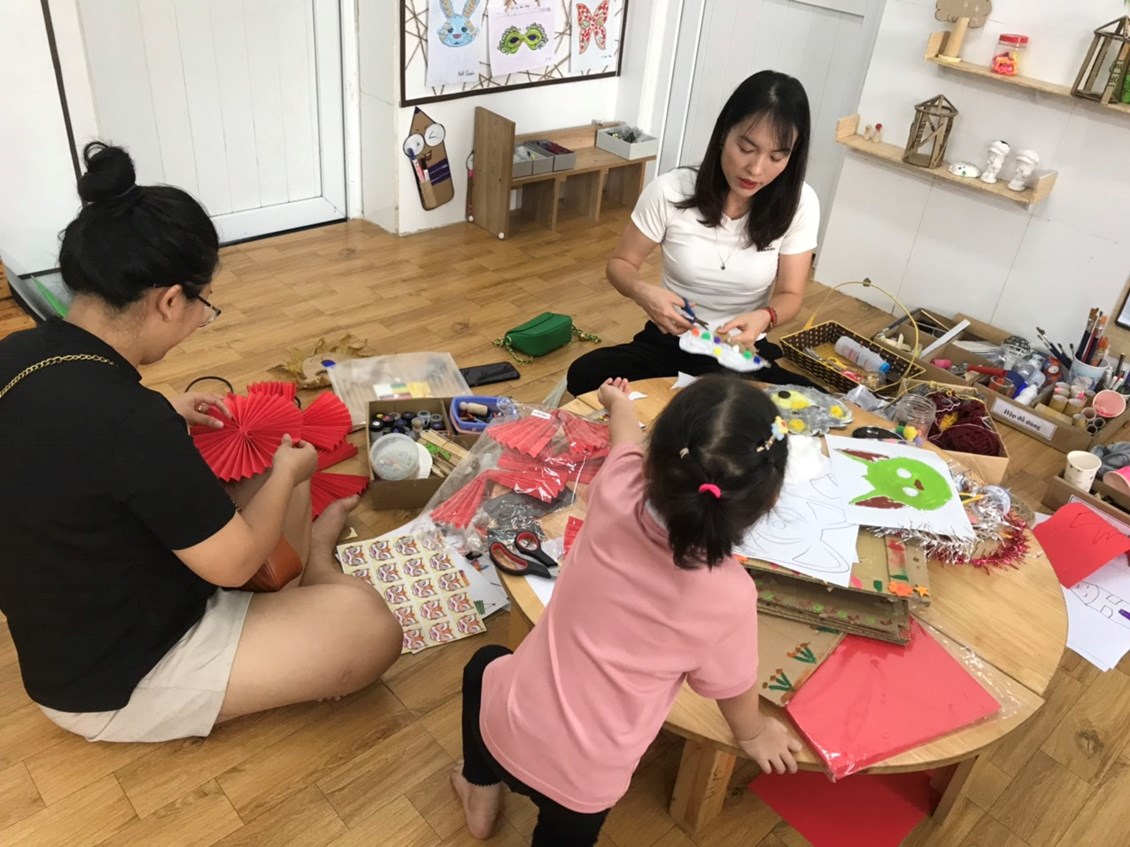 Bé Minh Quân cùng mẹ làm mặt nạ con sư tử