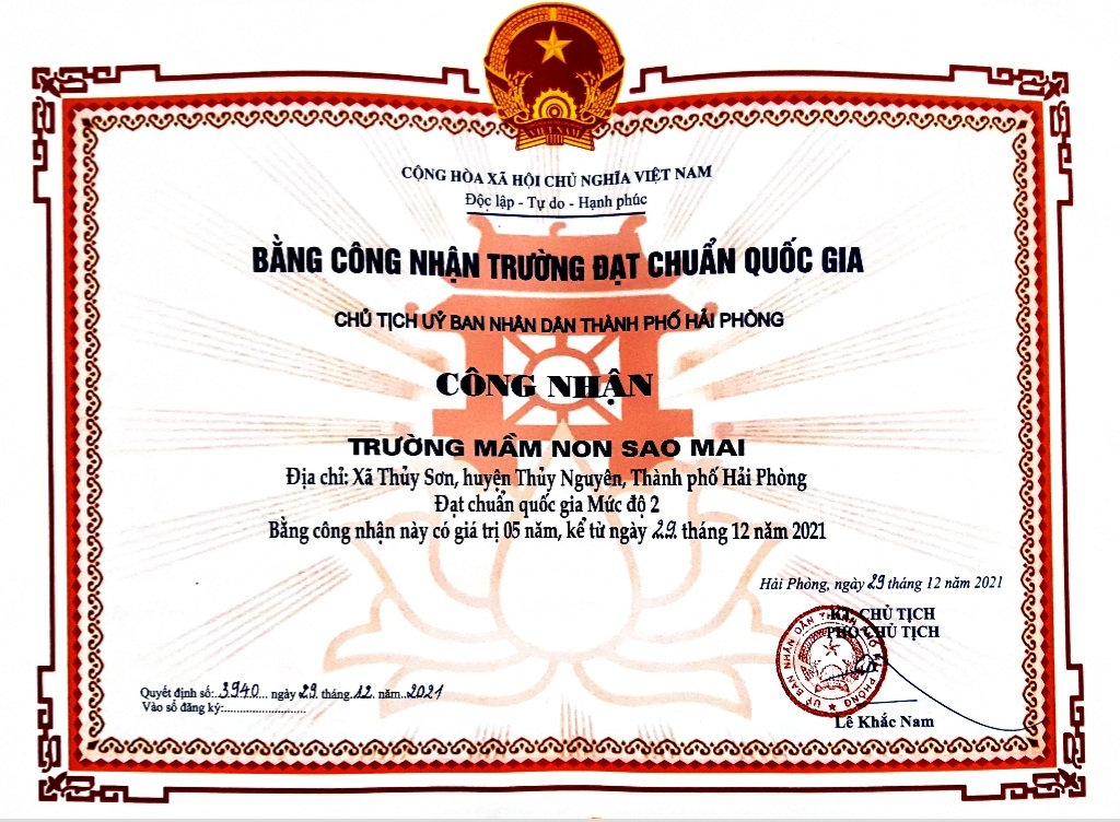 - Trường được Chủ tịch UBND thành Phố Hải Phòng cấp Bằng công nhận trường đạt chuẩn quốc gia Mức độ 2 , và Giám đốc Sở GD&ĐT thành phố Hải Phòng cấp Chứng nhận trường đạt Kiểm định chất lượng giáo dục cấp độ 3: