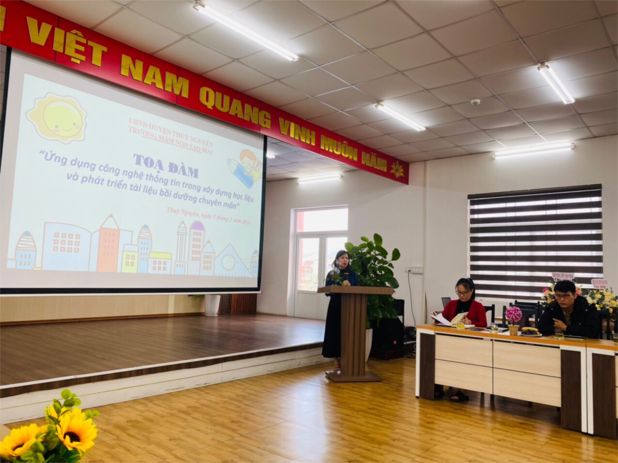 Nhằm theo kịp sự phát triển của công nghệ giáo dục và rút ngắn thời gian trong công tác thiết lập hồ sơ quản lý nhà trường, trường mầm non Sao Mai thúc đẩy mạnh quá trình Số hoá vào quản lý nhà trường, xây dựng học liệu và phát triển tài liệu bồi dưỡng chuyên môn; phát huy tốt các tiềm lực từ trí tuệ, công nghệ và tinh thần đoàn kết giữa nhà trường và phụ huynh nhằm xây dựng không gian số để trẻ được thụ hưởng chất lương giáo dục từ công nghệ ảo hiệu quả nhất, nhà trườngđã cử CBQL và giáo viên cốt cán tham gia các lớp tập huấn do PGD&ĐT huyện Thuỷ Nguyên tổ chức, mời các đồng chí cán bộ CNTT về nhà trường trực tiếp bồi dưỡng và hướng dẫn đội ngũ.