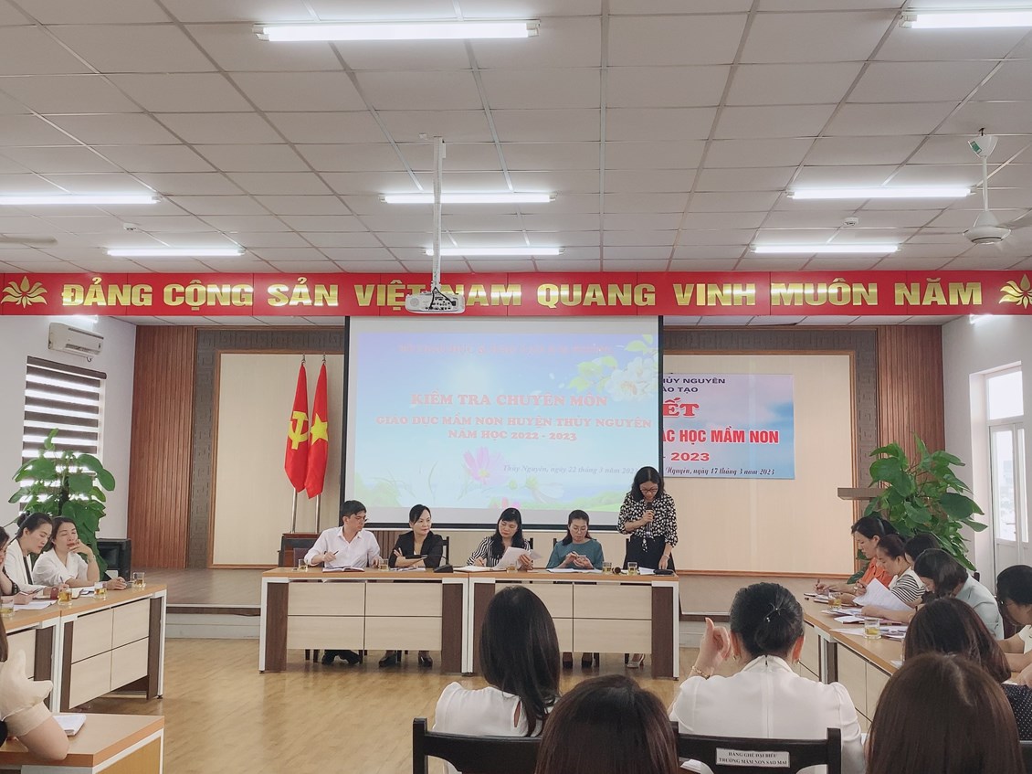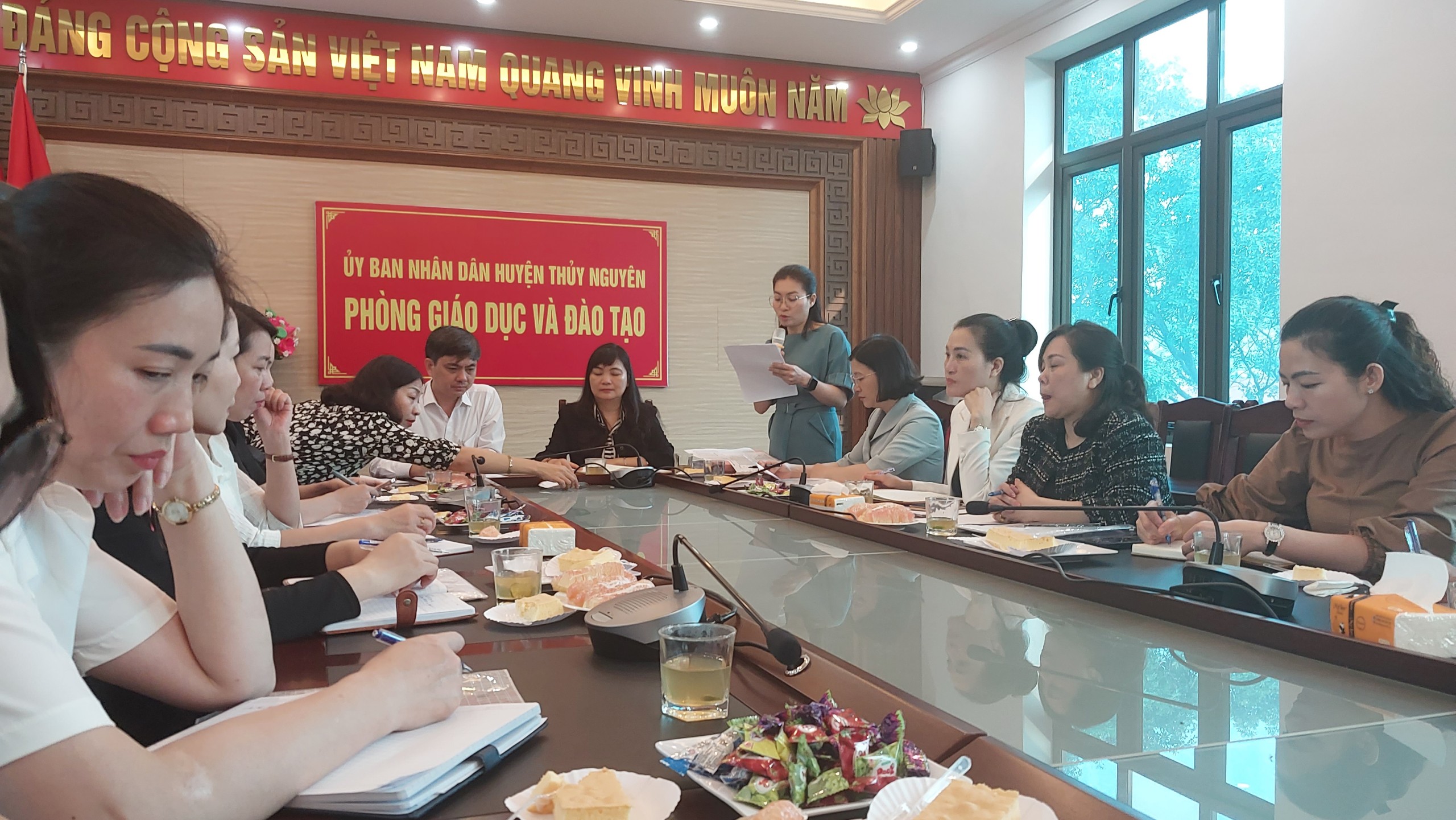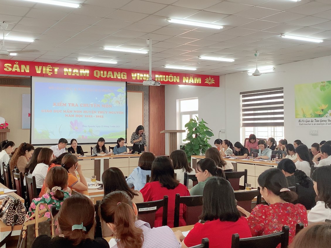 Trong buổi sáng đoàn về làm việc tại Phòng GD&ĐT Huyện Thủy Nguyên, kiểm tra đánh giá chất lượng 3 trường mầm non: Mầm non Dương Quan, mầm non Cao Nhân, Mầm non Kỳ Sơn. Đoàn đã tổng hợp và đánh giá rút kinh nghiệm vào buổi chiều tại trường mầm non Sao Mai cùng các đồng chí lãnh đạo chuyên viên PGD&ĐT huyện, các đồng chí hiệu trưởng các nhà trường mầm non trong toàn huyện.