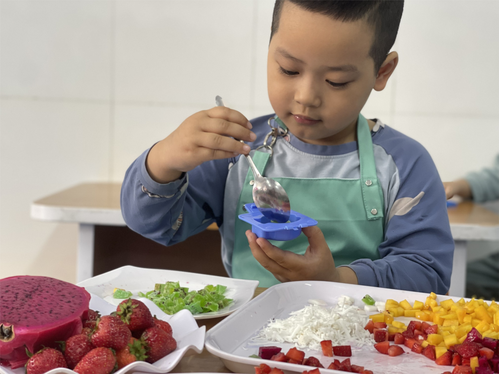 Chỉ một chút nguyên liệu: Dưa hấu, thanh long, kiwi, dâu tây, xoài, thạch và những chiếc khuôn xinh xinh… cùng đôi bàn tay khéo léo và sự hướng dẫn tận tình của cô giáo chúng mình đã có những ly thạch thơm ngon.