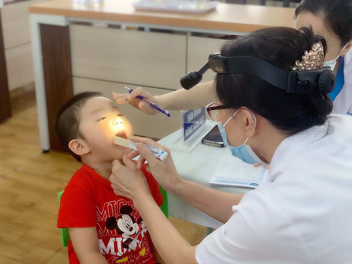 Bác sĩ khám răng và họng cho bạn ý