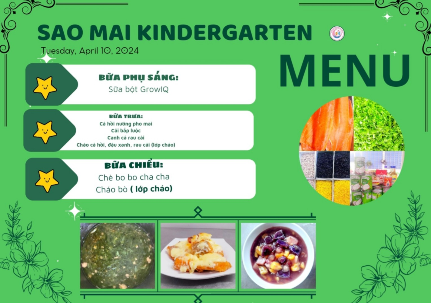 Dưới đây là một số hình ảnh các món ăn trong thực đơn thứ 4 ngày 10/4/2024